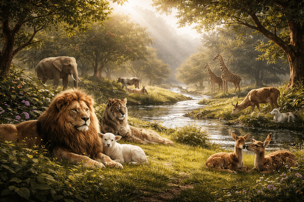 Isaías 11:6–9 describe un futuro restaurado donde el lobo y el cordero conviven, reflejando el modelo edénico original.